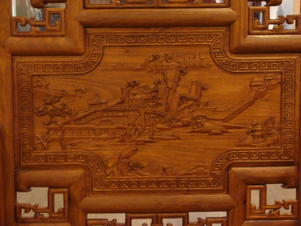 最后,再重點(diǎn)說(shuō)說(shuō)扶手內(nèi)外兩側(cè)處的紋飾圖案部分,同樣如上方“松柏庭宇云海圖”給人的第一感覺一樣,該處畫案整體之風(fēng)格偏重山水文人畫一類,依舊是挺拔筆直的松樹,閑庭屹立的庭宇,還有那可以倚照著波光漣漪的湖水,感受到的那悉簌搖擺的徐徐的微風(fēng),飄蕩在這靜怡的湖面之上。一座有著扶手的欄倚小橋駕于在湖面上,連接著湖岸兩端,幾處矮實(shí)的小戶瓦樓簇居而座,整體畫面給人一種“小橋流水人家”的彎延意境美,綿延厚絕。